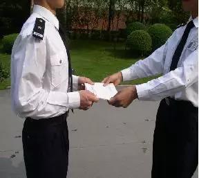 接班队员在距离交班队员3—5步时,相向站立,交接班队员同时敬礼,同时右跨一步,向前行进3—5步,同时转体,再行右跨一步,立正后再行敬礼。如有物品或工作事项需交接的,待交接班仪式完毕后,再行交接。(如图)