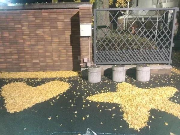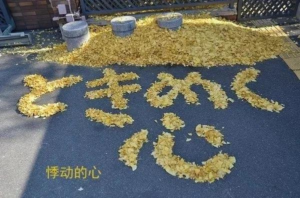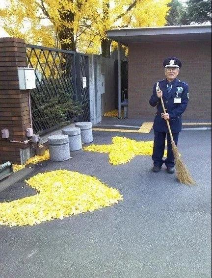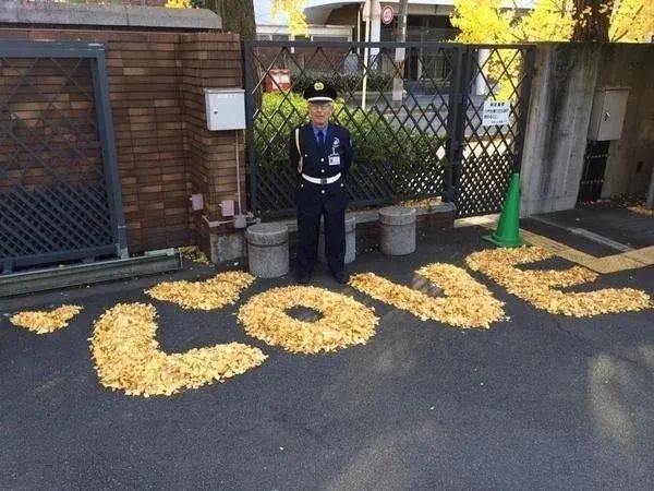 2014年11月28日,京都工艺纤维大学的著名保安大爷,每年入秋都将银杏叶扫成各种暖心图案,成为校园一景。校内单身汪纷纷表示,看完很想找对象……